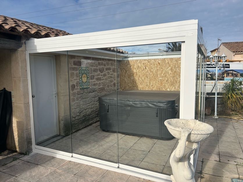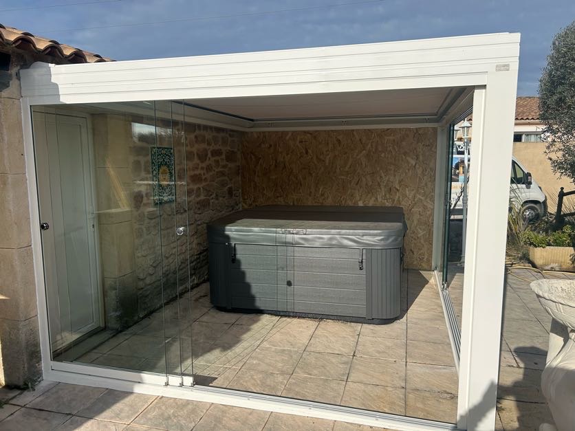 Pour maximiser le confort et l'utilisation de cet espace tout au long de l'année, COLADIS a intégré un mur de verre coulissant. Ce système innovant permet de se protéger efficacement du vent, de la pluie ou des températures plus fraîches, tout en garantissant un apport maximal de lumière naturelle et une vue imprenable sur les extérieurs. La transparence du verre préserve la sensation d'ouverture, transformant la zone du jacuzzi en un salon extérieur cosy et protégé.