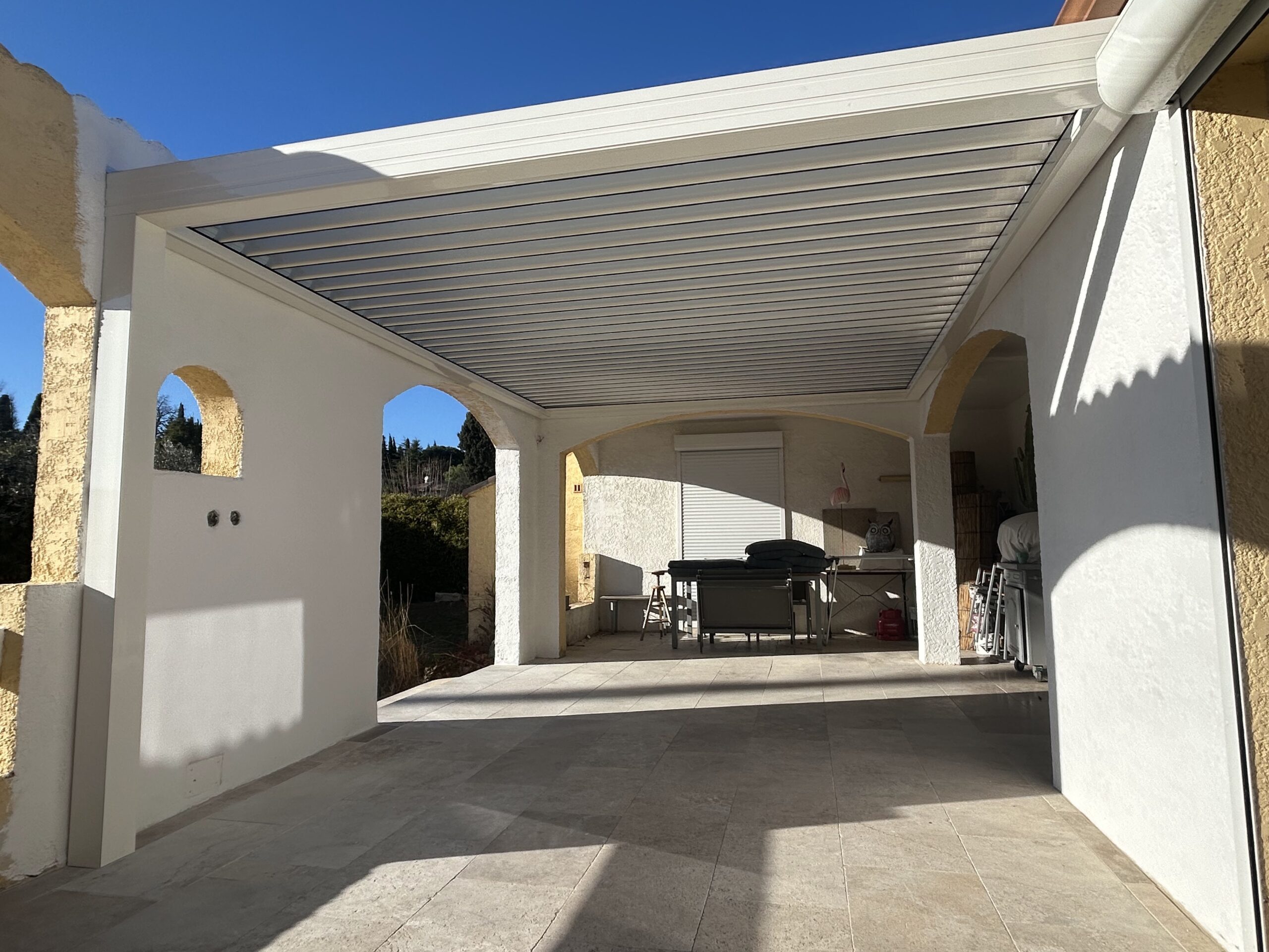 COLADIS votre expert en aménagement extérieur basé à Paulhan, vous présente une pergola bioclimatique en aluminium de couleur blanche réalisée à Saint-Aunès, près de Montpellier.