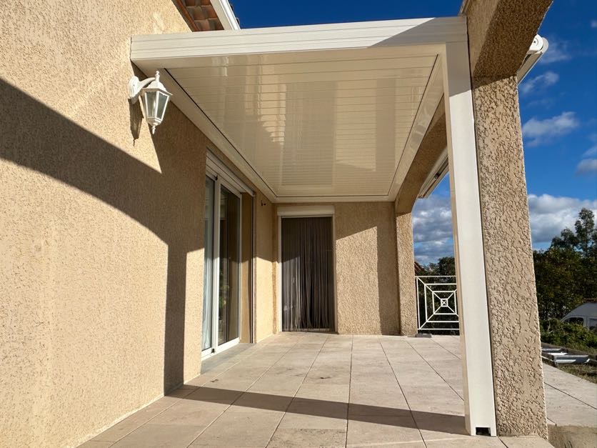 La pergola s'intègre avec élégance à l'environnement existant de la maison. Sa couleur blanche a été choisie avec soin pour s'accorder avec le crépis beige clair de la façade, créant une harmonie visuelle apaisante et contemporaine. Cette installation se distingue par sa conception astucieuse : la pergola s'intègre si parfaitement aux éléments existants de la maison qu'elle ne nécessite qu'un seul poteau pour son maintien, offrant ainsi un espace aéré et une vue dégagée sur la terrasse.