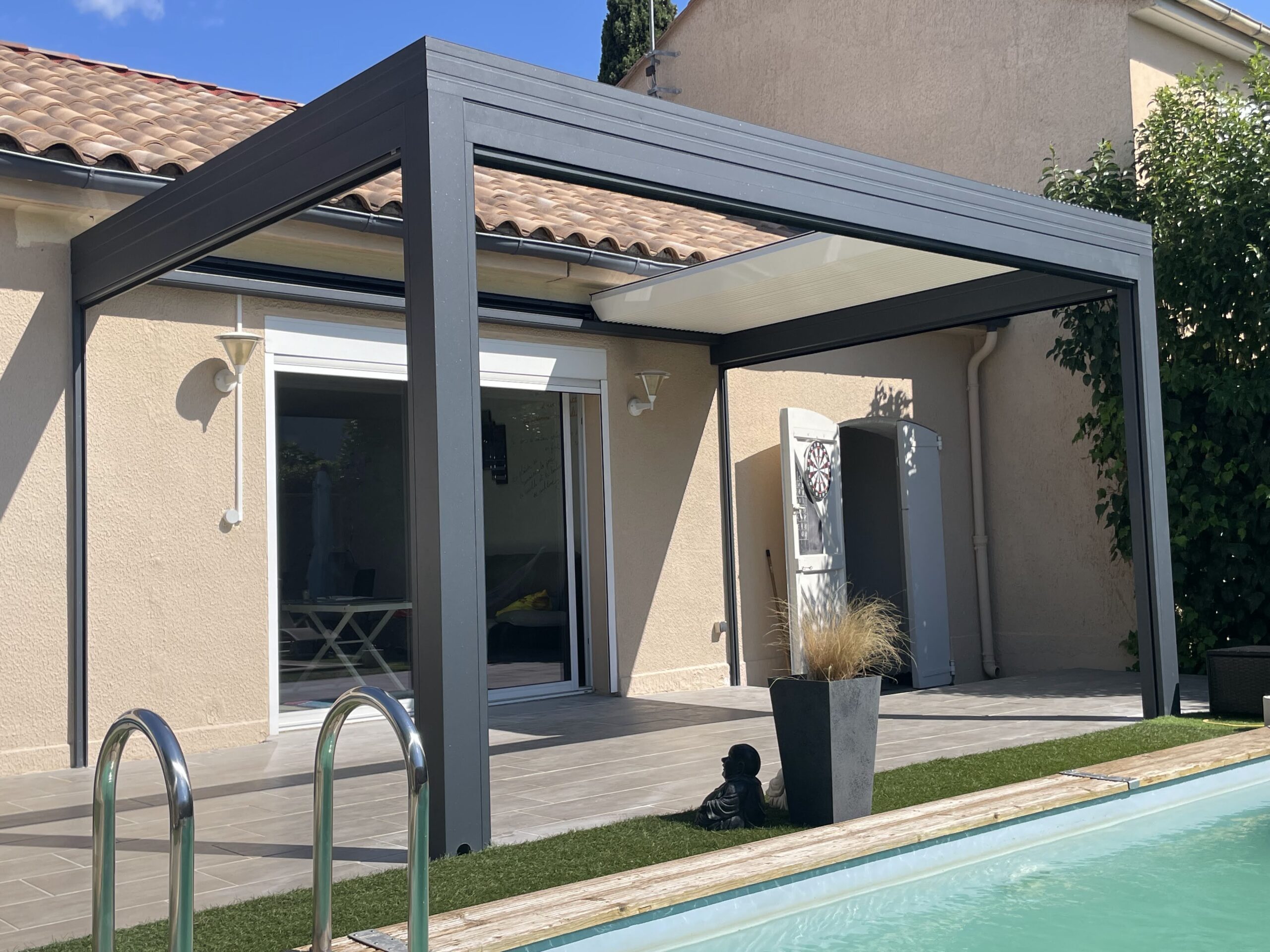 Fruit du savoir-faire de COLADIS, cette pergola bioclimatique à Villeneuve-lès-Béziers combine lames rétractables, protection latérale et gestion intelligente pour espace confort utilisable en toutes saisons.