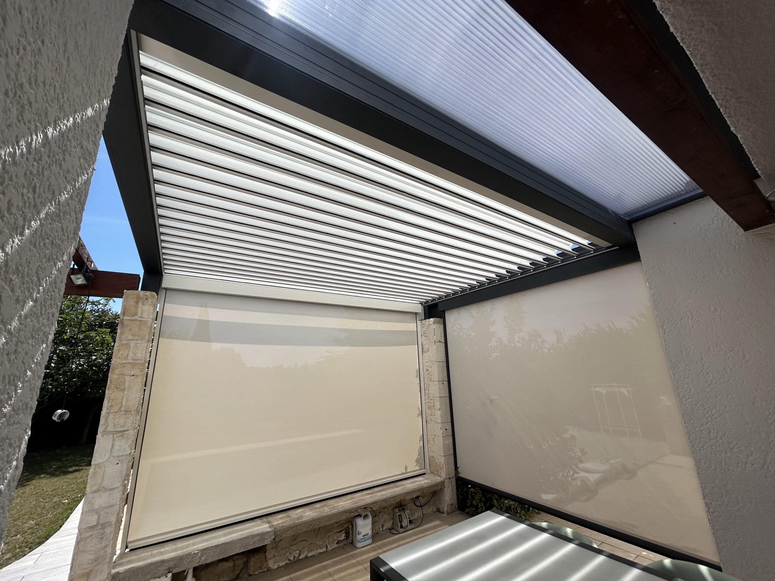 La toiture est équipée de lames rétractables blanches, offrant la possibilité unique de dégager totalement le ciel pour un ensoleillement maximal ou une vue dégagée. Elle est également équipée de deux stores ZIP Screen avec toile microperforée, dont l'un est astucieusement positionné entre les deux poutres en pierre, offrant une protection solaire et un brise-vue discret et efficace.