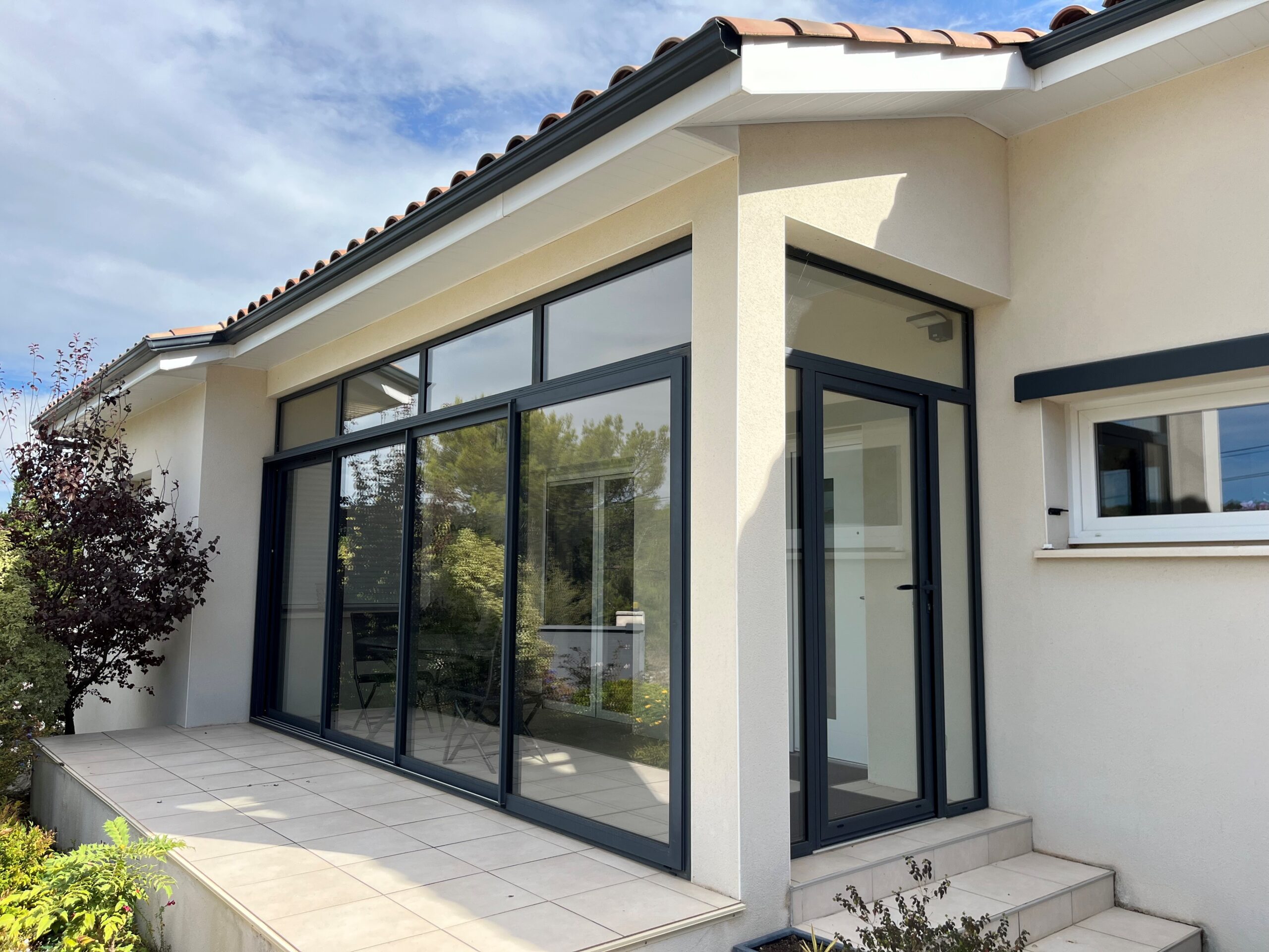 Véranda moderne aluminium gris foncé sas d'entrée vitré