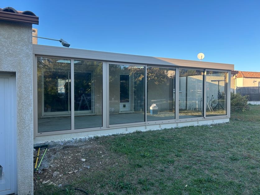 La structure en aluminium de couleur Dune a été choisie avec une grande attention pour s'accorder parfaitement avec le crépis des murs de la maison. Cette harmonie des teintes assure une intégration naturelle et élégante, faisant de la véranda une véritable continuité architecturale de l'habitat.