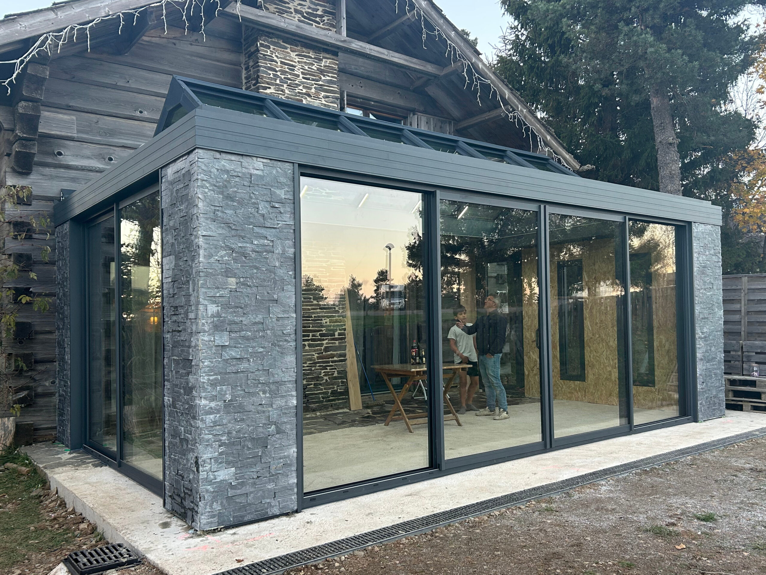 Les baies coulissantes, élément central de cette véranda, permettent une ouverture maximale sur la terrasse, inondant l'espace de lumière naturelle et offrant une vue panoramique sur la forêt. Les murs en Tecwome, avec leur revêtement imitation pierre ardoise, apportent une touche de rusticité et de chaleur à l'ensemble, s'harmonisant parfaitement avec l'environnement naturel. La toiture, quant à elle, est un modèle de conception, avec son dôme de verre central équipé de LED, qui apporte une source de lumière naturelle supplémentaire et crée une atmosphère chaleureuse et conviviale. Le Thermotop en périphérie assure une isolation thermique optimale, permettant de profiter de la véranda en toutes saisons.