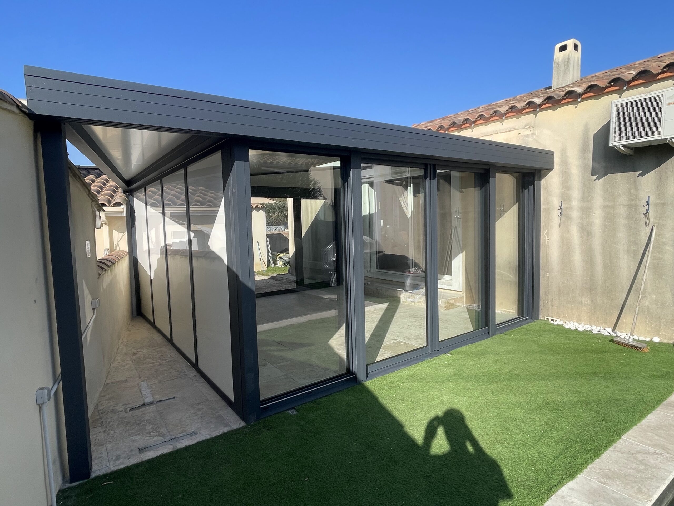 COLADIS, présent à Paulhan et Mauguio, vous présente une véranda sur mesure à Vauvert, près de Montpellier. Cette installation transforme une terrasse carrelée en un espace de vie supplémentaire élégant et fonctionnel, adossé à la façade de la maison et offrant des solutions ingénieuses pour le confort et l'intimité.