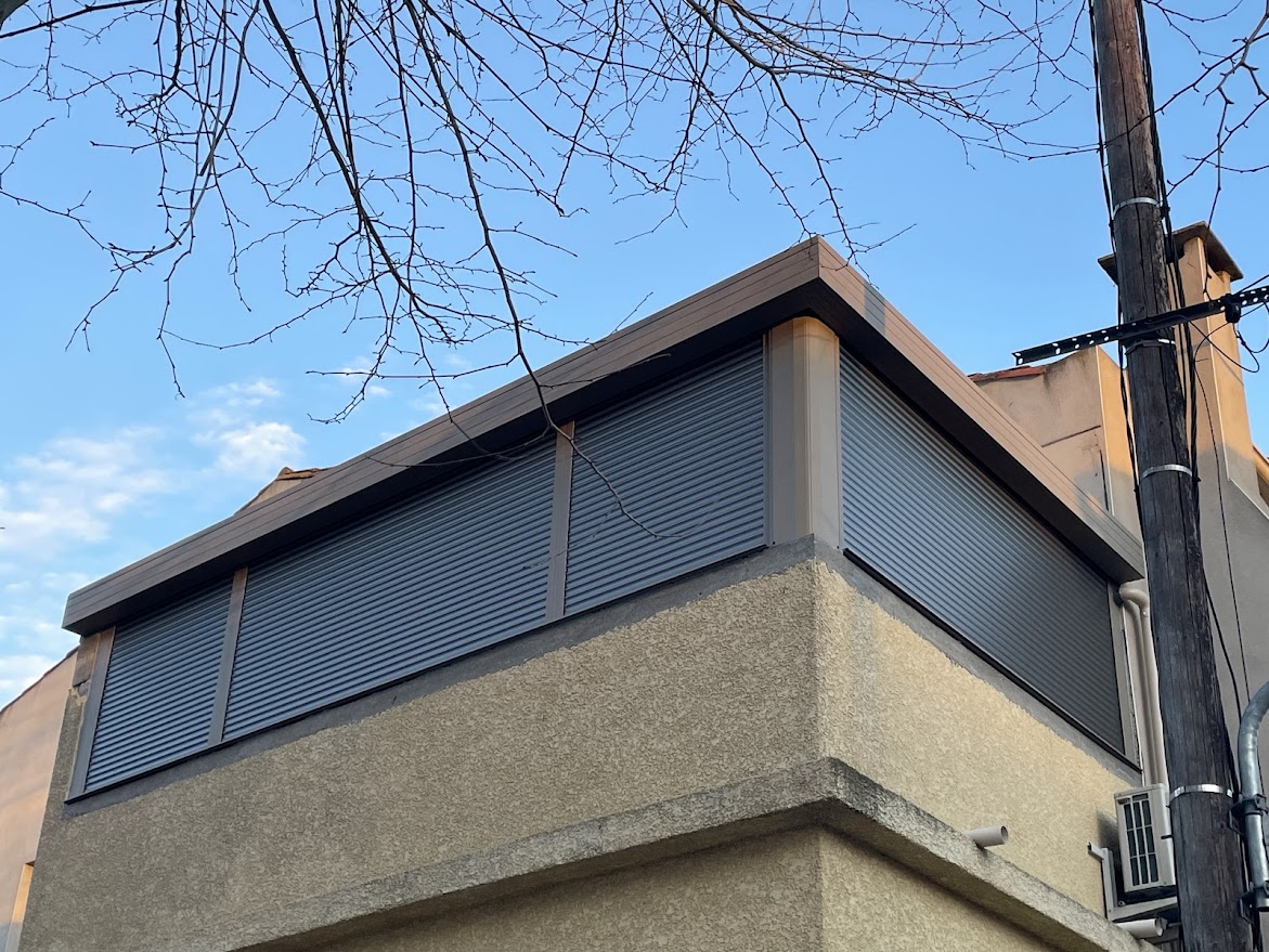 Véranda moderne sable avec toiture pleine plate et volets roulants