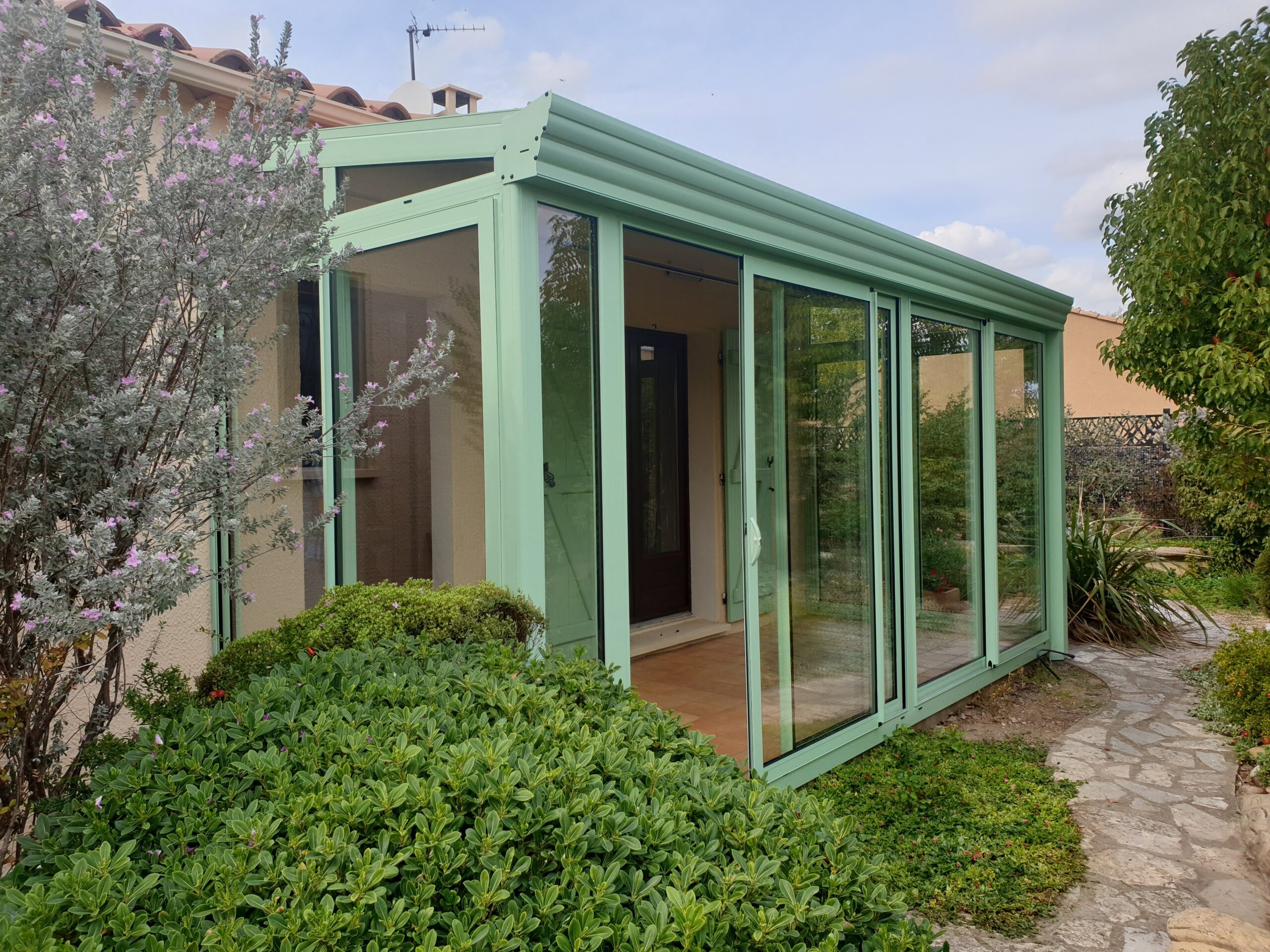 La structure en aluminium de couleur Vert Pâle a été choisie avec soin pour s'accorder parfaitement avec les volets en bois existants de l'habitation. Cette coordination des couleurs assure une intégration harmonieuse et apporte une touche de douceur au contraste formé par la façade en crépit blanc et la toiture en tuiles.