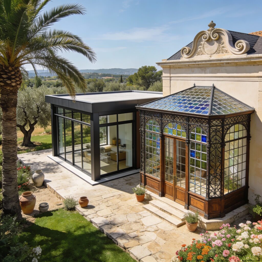 Les coloris actuels valorisent ce style moderne. Les gris, noirs ou teintes sablées s’accordent aux menuiseries récentes. Le contraste avec les enduits clairs souligne l’architecture. La véranda contemporaine donne alors un caractère plus affirmé à la maison.